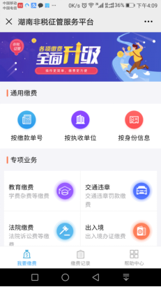⑥ 缴费成功后,用户可返回“湖南非税征管服务平台” 首页,点击底部的缴费记录,即可以查看通过平台缴费的所有记录,点击某一条记录,即可查看记录的详细信息。