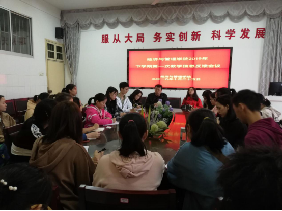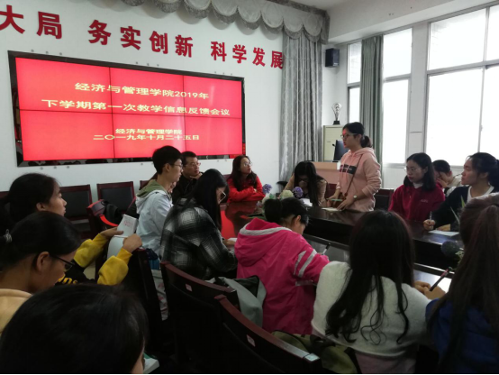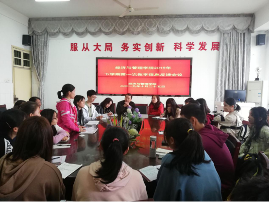 2019年10月25日中午13:00,太阳成集团tyc122ccvip于文科楼C栋五楼会议室召开2019年下学期第一次教学信息反馈会议。公司党总支副书记黄懿、副经理屈瑜君、教务秘书水丽蓉老师,员工分会学习部部长王林、副部长欧阳照芳、副部长刘柏靖以及太阳成集团tyc122ccvip17--19级各班学习委员参加此次会议。