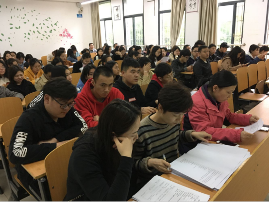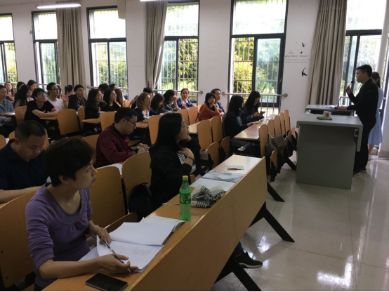 员工们和老师们正在认真听演讲