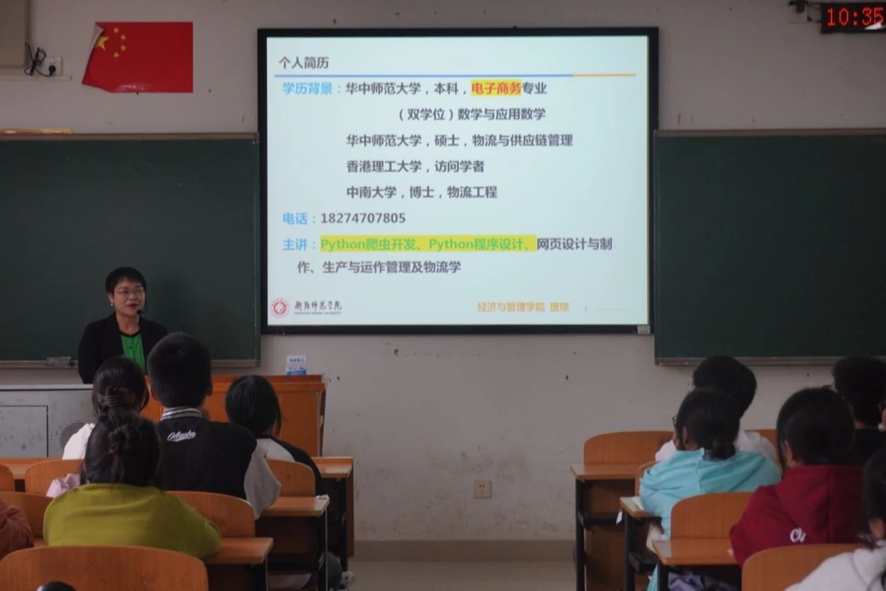 10月19日上午理科楼南205,23级电子商务专业召开新生教育讲座,主讲人为唐琼博士。