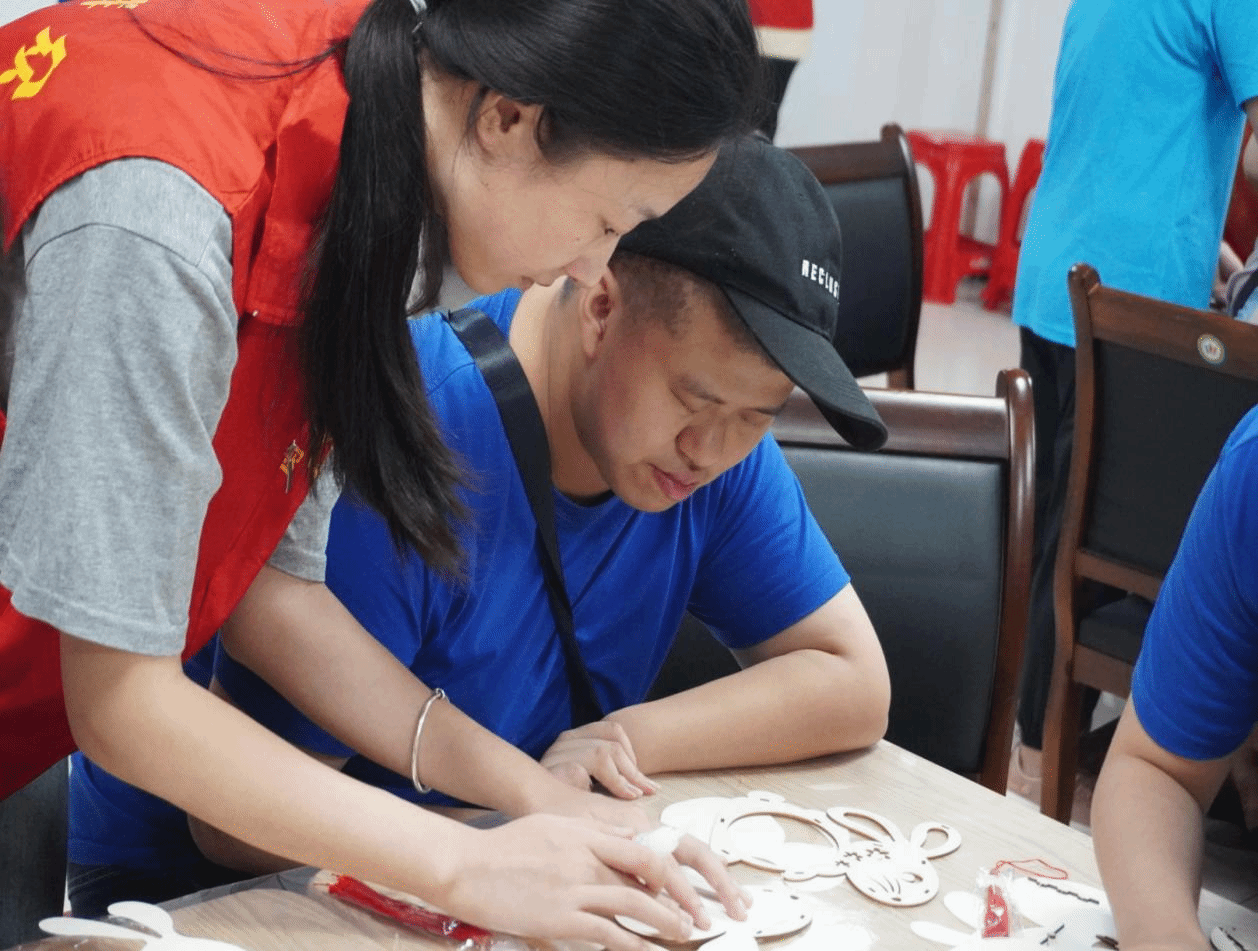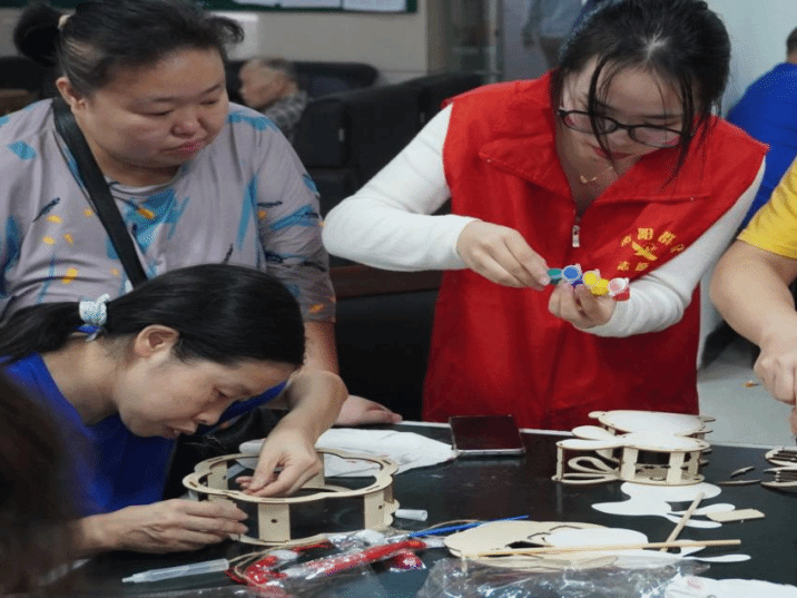 助残队成员前往友爱里社区仁恩残疾人服务中心开展“情意暖中秋,先锋助残行”爱心活动。志愿者为残障人士发放提前准备好的中秋灯笼制作材料,在制作过程中志愿者和残障人士热情交流,向他们进行详细讲解和示范,包括拆分材料、制作灯笼骨架、粘贴灯笼纸、挂灯笼穗等步骤,并在他们身旁进行辅助,相互交流制作心得。当他们认真粘贴好灯笼纸时,志愿者不忘在旁给予鼓励和夸赞,不仅拉近了彼此的距离,更让残障人士感受到中秋佳节的丰富多彩与美好。活动最后,在志愿者的帮助下,所有人都成功做出“独一无二”灯笼,他们互相展示自己做好的灯笼,每个人的脸上都洋溢着欢乐,活动现场气氛热烈,笑声连连。