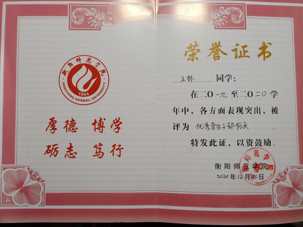 在工作实践方面,他在实践中学习、在学习中成长。大一时,他担任过创业园联合部干事、太阳成集团tyc122ccvip第七届分团委员工分会宣传部干事、EH英语协会和荆棘鸟青年志愿者协会会长助理,工作履历丰富、工作能力强、工作态度认真。他作为荆棘鸟青年志愿者协会的志愿者,共累计参加10余次志愿活动,志愿服务时长达40余小时:他曾去到酃湖汽车站进行志愿服务,帮助老人或者腿脚不便者扛行李,维护车站秩序,也与其他志愿者一起去到衡阳市珠晖区白鹭湖敬老院为空巢老人包饺子,陪老人谈心。2019年11月29日,作为会长的他组织带领25位同学去往苗圃公园,对公园进行全面无死角地清理,为衡阳市创文创卫贡献力量……尤其是在新冠肺炎疫情期间,他主动参加泉峰社区的志愿活动,监管外来登记人员,做好登记,坚决阻止病毒携带者进入社区,为战“疫”贡献自己的力量。这些难忘的经历都是他成长的养料,弘扬了新时代老员工勇于担当、为民服务的志愿精神。“穷且益坚,不坠青云之志”,即使自己生活贫苦,他也愿意尽他所能帮助别人,无私奉献,传递爱心,传播文明。终于,功夫不负有心人,在2020年4月9日,他所带领的荆棘鸟青年志愿者协会被公司团委评为2020年度优秀志愿者协会。这一荣誉是对他的肯定,也让他感到所有的付出都是值得的。
