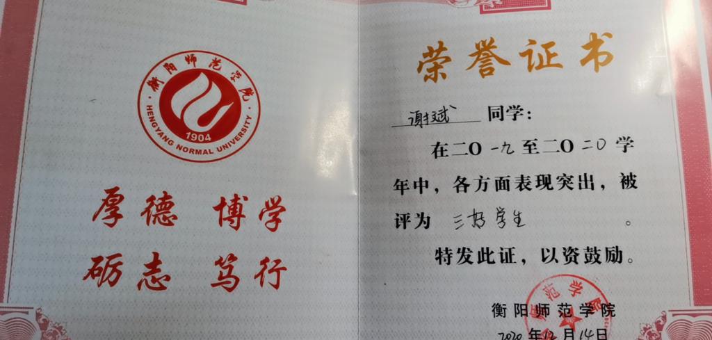 在学习方面,她时刻谨记学习是第一要务,并且无任何作弊等违纪违规行为。大学以来,她刻苦学习,认真钻研,在大一和大二学年均获得了优异的成绩。曾连续两年获国家励志奖学金、“三好员工”荣誉称号;在2018-2019学年获校二等奖学金,2019-2020学年获校一等奖学金。